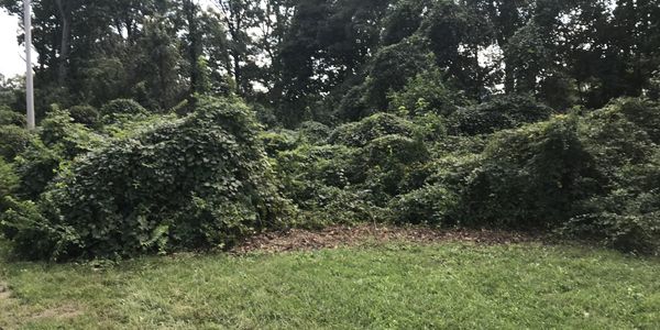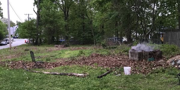 Yard full of brush, trash, barbs, trees, weeds, rock and building material